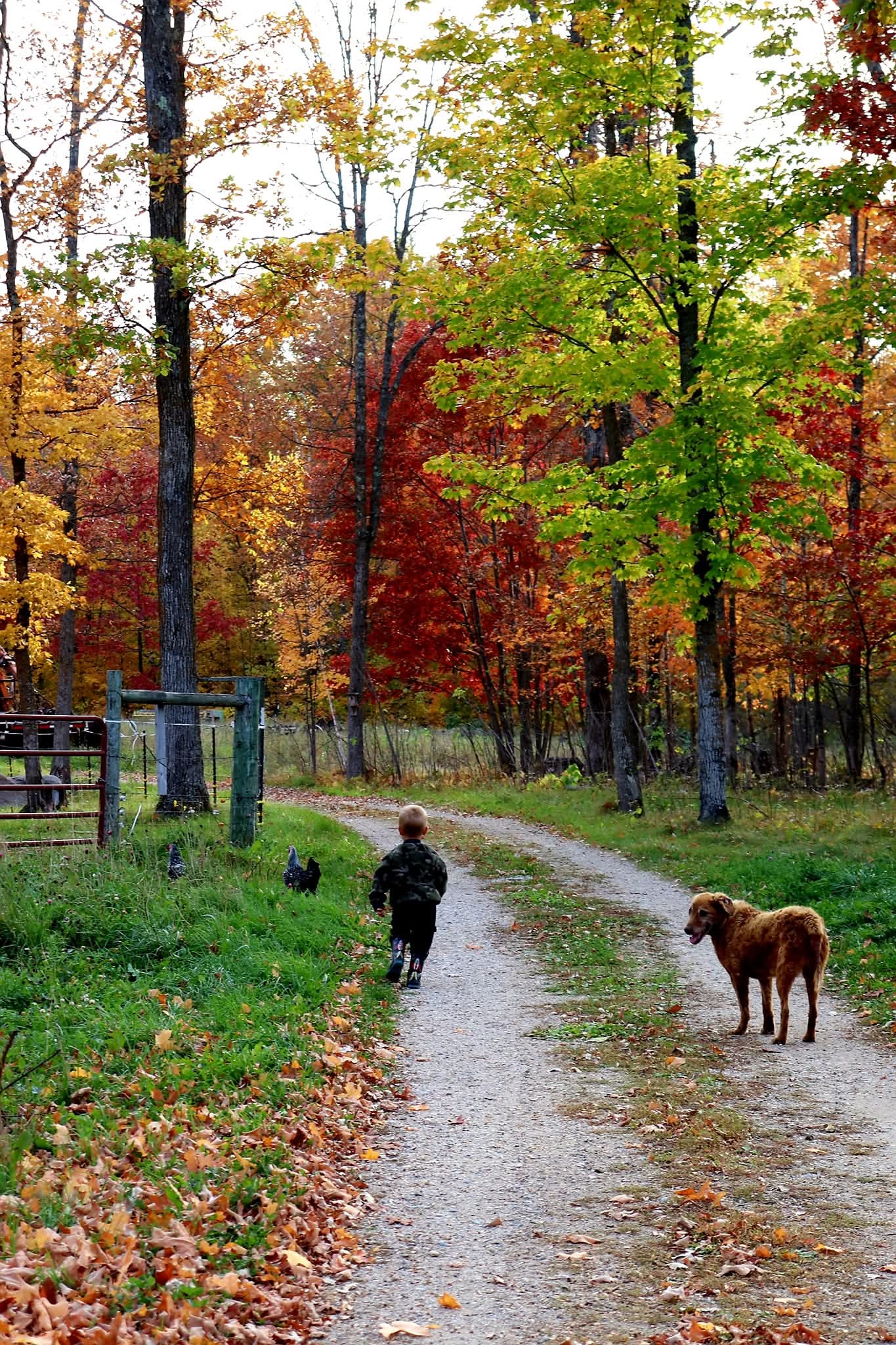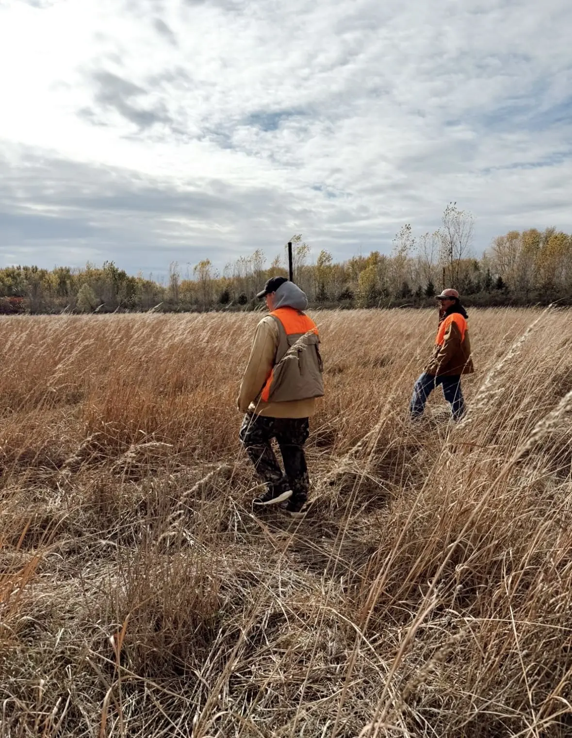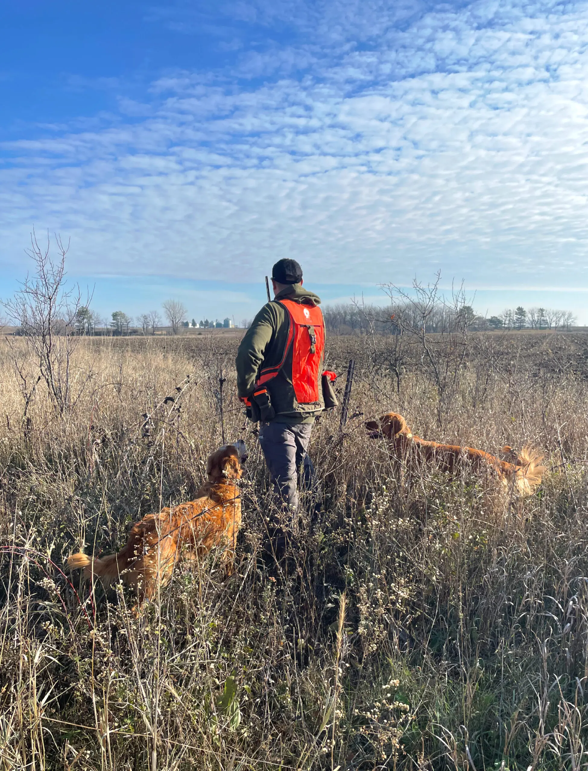 Two Golden Retrievers and their human embark on a fall day upland hunt.