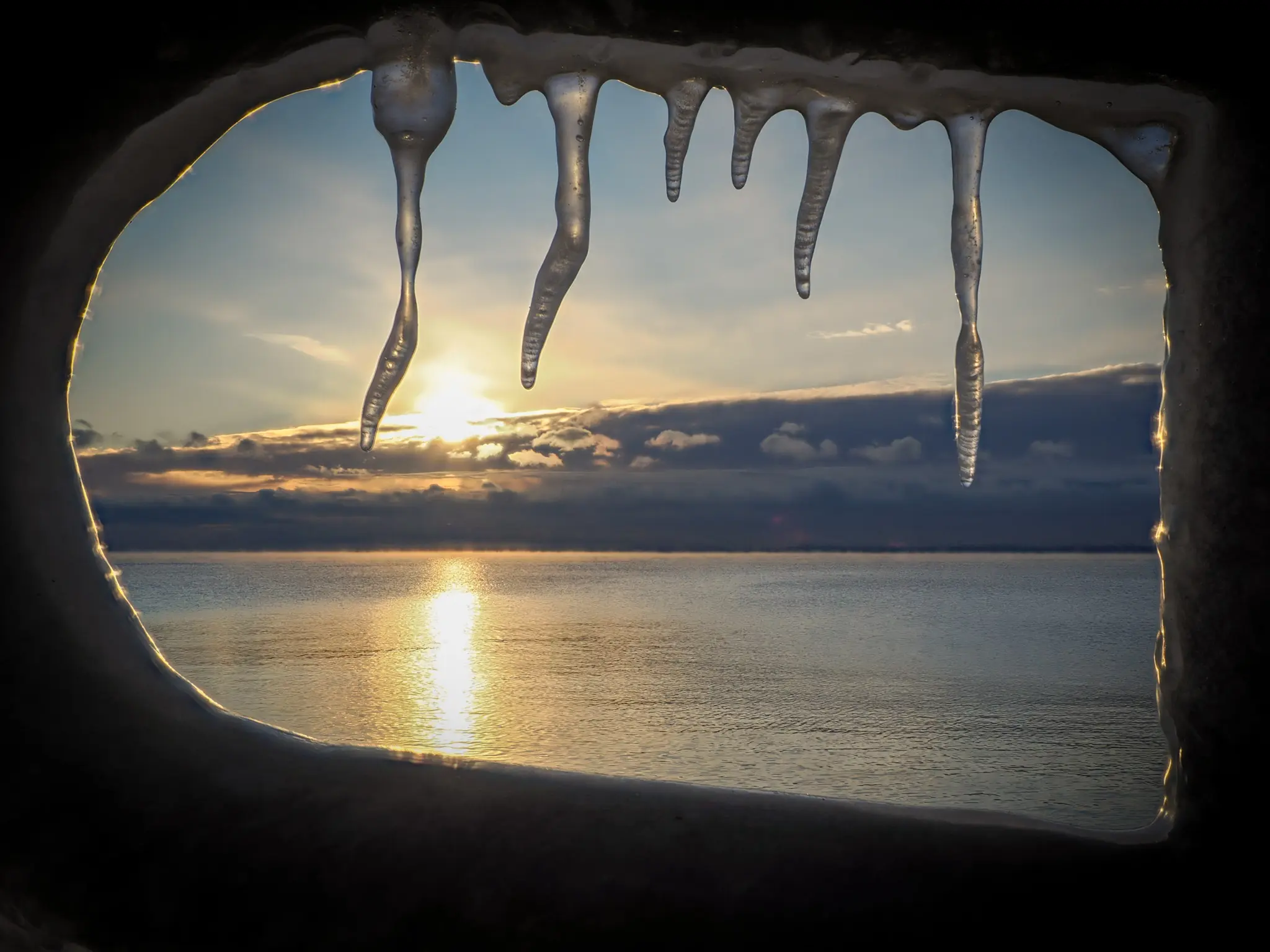 Sunrise and icicles captured through a handrails at McQuade Safe Harbor, Lake Superior, Duluth, Minnesota.