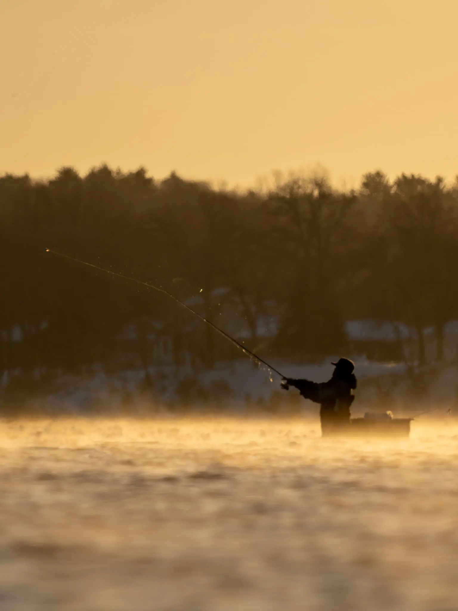 An angler fishing on the Mississippi in December during and amazing sunset and cold air temperatures, creating a beautiful sea smoke in the water.